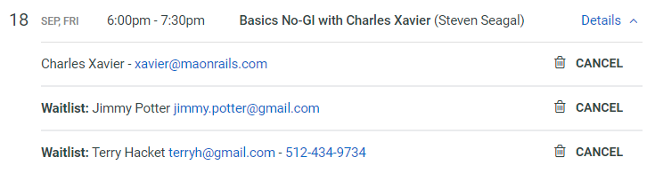 When someone cancels a booking for a session that has a waitlist, the next person in line gets their spot. If the session requires payment for booking, an invoice will be generated at that time and included in the bookings confirmation to be paid online.