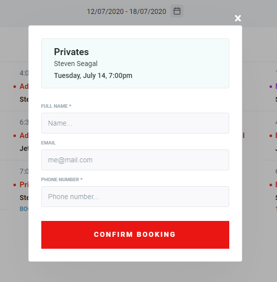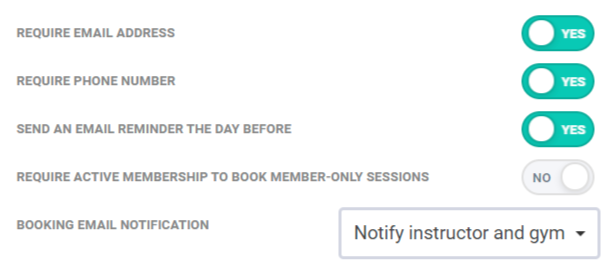 - Booking Email notification: When a booking is made, the person who made the booking will receive a confirmation Email. You can also have the instructor receive a booking notification (make sure to put an Email address on their instructor profile), and optionally a booking notification will be sent to the gym Email in your account.