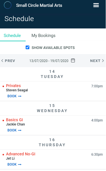 Once you have several bookable slots, those will be available for booking on the gym schedule screen. A "Book" link will appear next to those sessions -