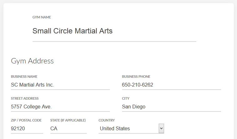 General gym details can be changed via the Gym Settings screen. The gym settings screen is similar to the form you filled out when you first created the gym, and includes the following details: