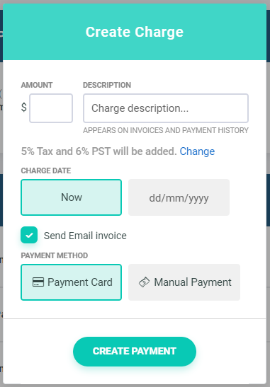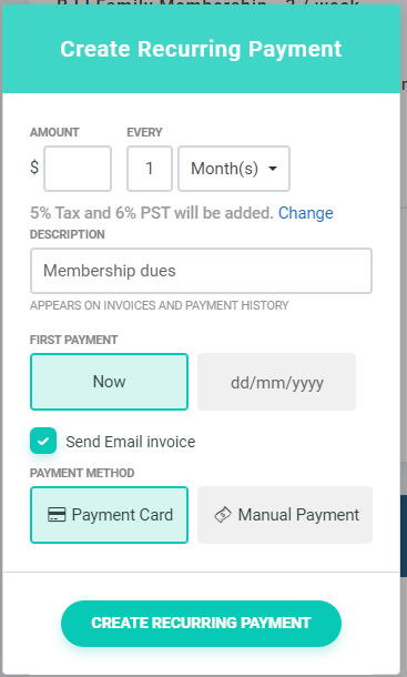 - Payment method - We can select to use the payment method on file, or set it up as a manual payment. Manual payments get confirmed manually by managers after being paid offline (cash, check).
