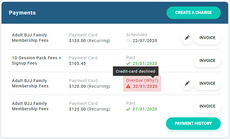 Individual payments made by the member appear in this section of the profile. This includes past payments, failed payments and upcoming scheduled payments.