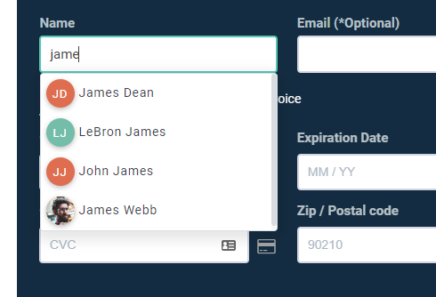 If you are creating a sale for an existing member, you can use any payment methods they already have on file. Start entering a member's name, and pick them from the dropdown that shows up below.