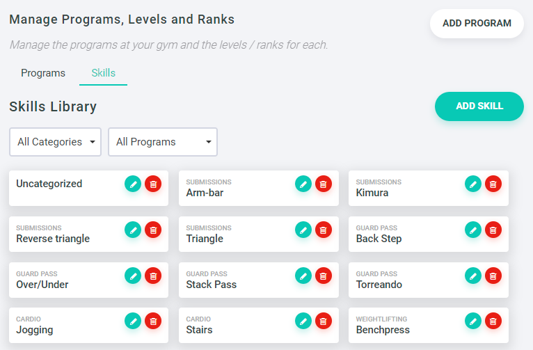 You can create a skills library that can be used for setting up your schedule, tracking progress in skills for ranking purposes, and provide a useful resource for members to review their attendance history.