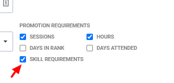 - Set as promotion requirement: This setting allows you to automatically set the skill to the promotion requirements to the ranks/levels selected. Instead of assigning skills to individual rankings, you can use this feature now to streamline adding skills to ranks/levels.