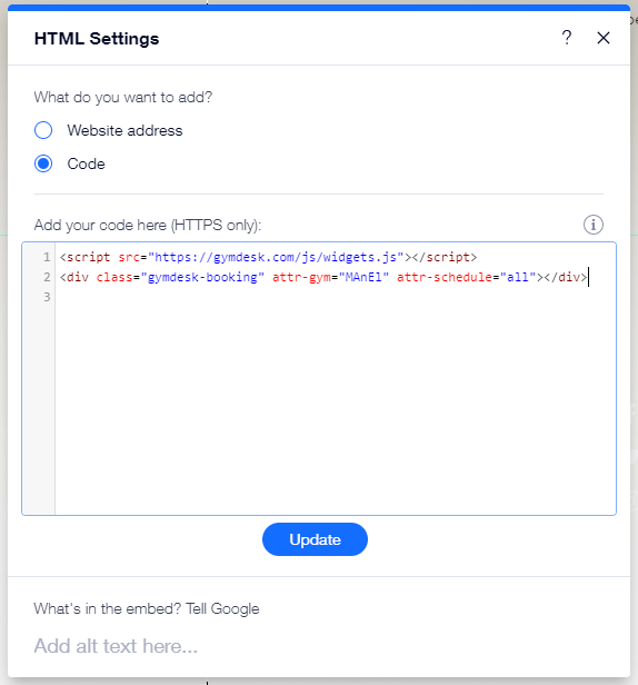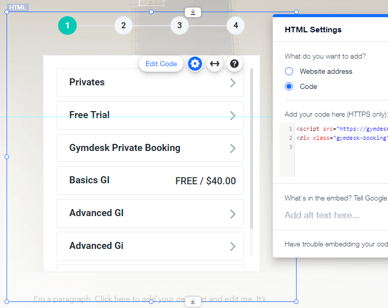 Once the widget is created, click on the "Code" option, and paste both the <script src="https://gymdesk.com/js/widgets.js"></script> tag and the code for the widget you want to insert, in the box that reads "Add your code here (HTTPS only)" -